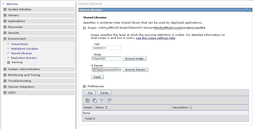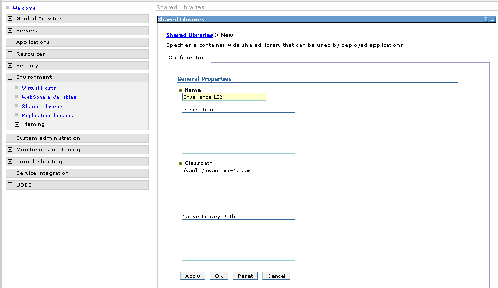 Dans un premier temps, il faut rajouter la librairie pour chaque JVM. Pour ce faire, aller dans Environment / Shared Libraries. Sélectionner la bonne JVM, puis faire « New ».