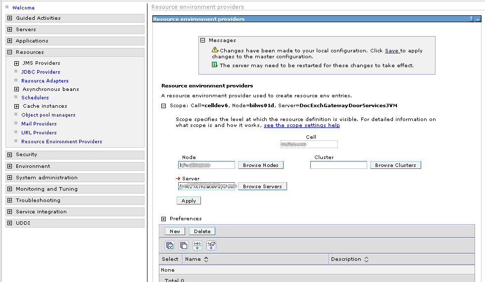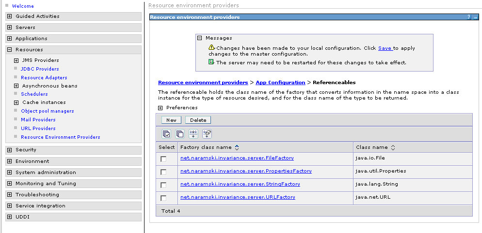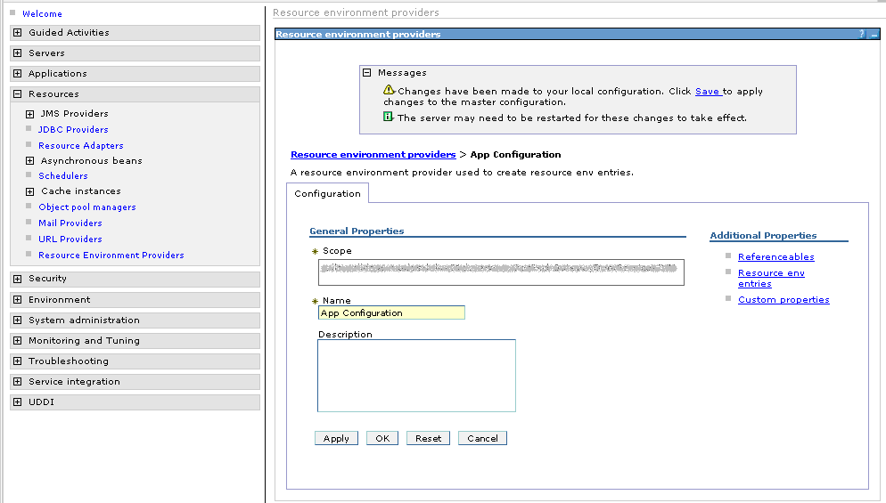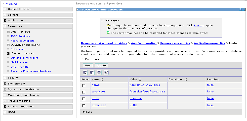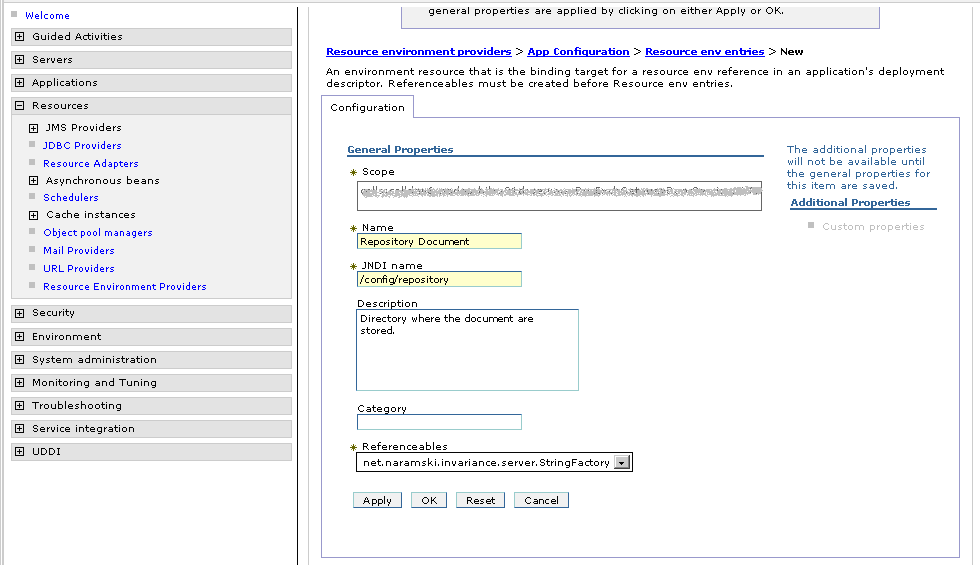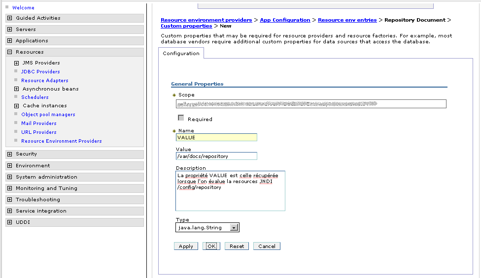 Dès lors, on peut créer de nouvelle Resources au niveau de la JVM et elles pourront être utilisées par l’application. Pour créer de nouvelles resources, aller simplement sur « Resources », « Resources Environment Providers ».